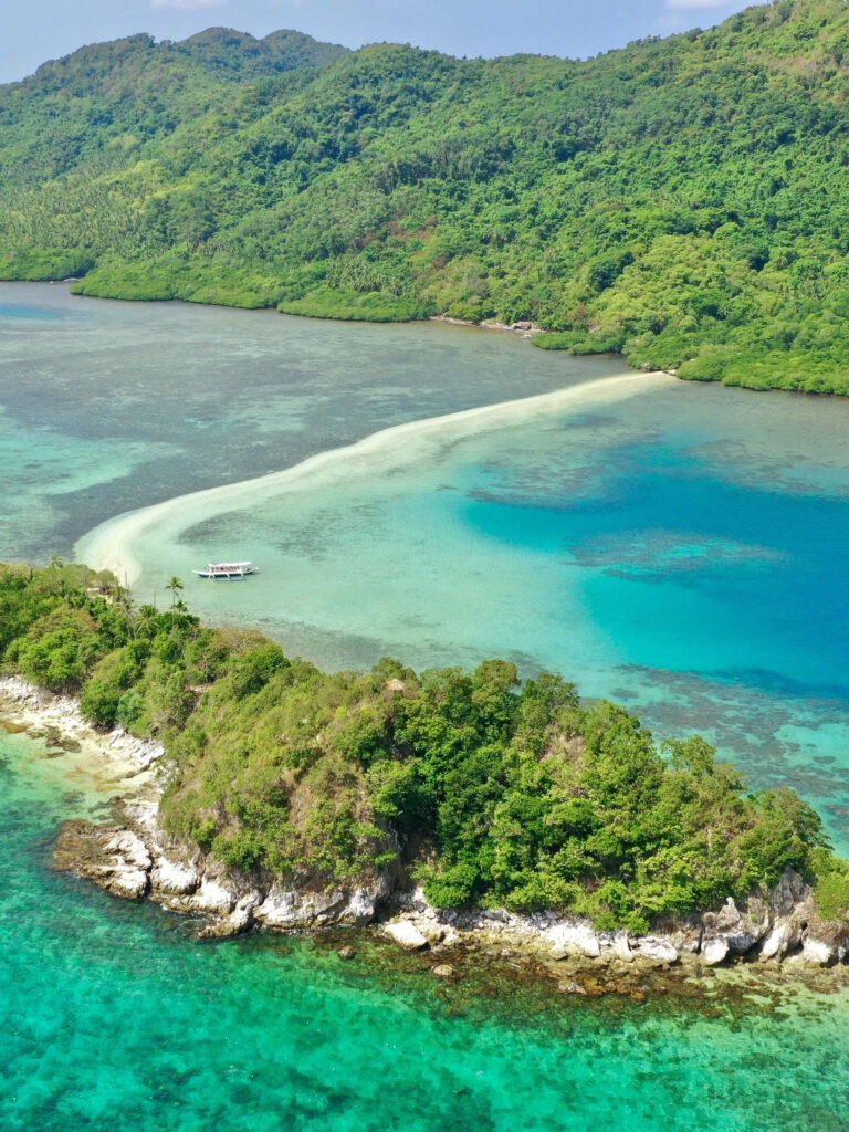 Walk along a stunning S-shaped sandbar that emerges from the sea at low tide, connecting two islands with a beautiful ribbon of white sand.