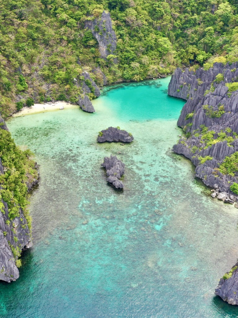 Just a short hop from El Nido town, Marimegmeg Beach offers a relaxed stretch of golden sand lined with chill beach bars, making it a famous spot for watching the sunset.